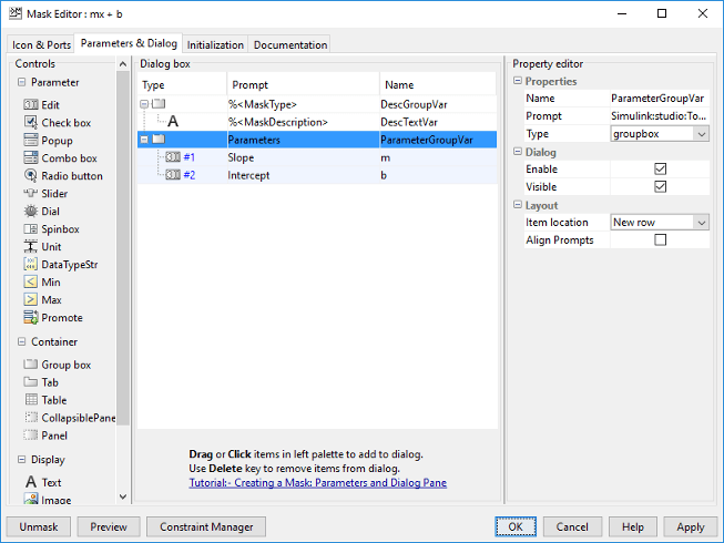 При вводе значений параметров «Уклон» и «Пересечение» в диалоговом окне маски эти значения внутренне присваиваются переменным. m и b. При моделировании модели блок усиления и блок константы ищут числовые значения m и b и применить их для разрешения уравнения y = mx + b.
