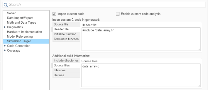 для открытия диалогового окна «Параметры конфигурации». На панели Цель моделирования определите файл заголовка в разделе Вставить пользовательский код C в сгенерированном: > Файл заголовка.