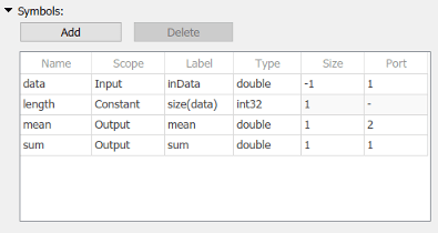 Размер - размер данных символа. Блок C Function поддерживает только скаляры и векторы. Матрицы и массивы с более высокой размерностью не поддерживаются. Для определения размера вывода можно использовать выражение размера. Использовать -1 для наследования размера.