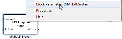 Для реализации блока с другим системным object™ щелкните правой кнопкой мыши системный блок MATLAB и выберите «Параметры блока» (MATLABSystem). Затем используйте диалоговое окно блока для определения нового имени класса в имени системного объекта. Дополнительные сведения см. в разделе Реализация системного блока MATLAB.