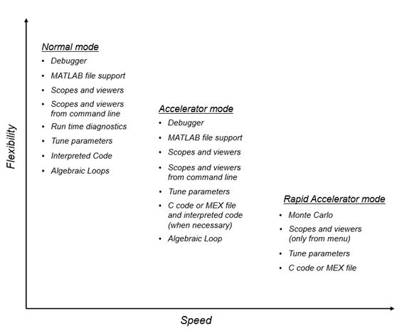 Режим ускорителя находится между режимами Обычный (Normal) и Быстрый ускоритель (Rapid Accelerator) по производительности и взаимодействию с моделью. Режим ускорителя не поддерживает большинство средств диагностики во время выполнения.