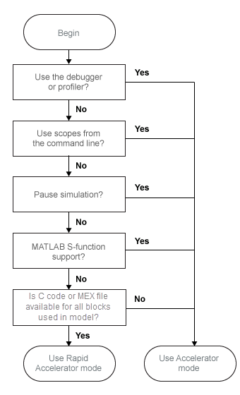 Режим Rapid Accelerator работает быстрее всего, но этот режим не поддерживает отладчик или профилировщик, и работает только с теми моделями, для которых доступен код C или файл MEX для всех блоков в модели.