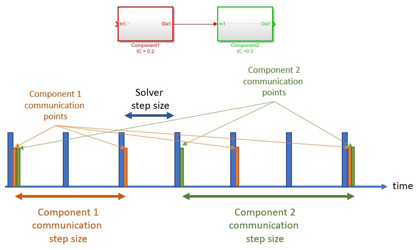 При моделировании Simulink размер шага решателя должен быть целочисленным делителем каждого периодического времени выборки дискретного блока. Другими словами, если компонент совместного моделирования определяет свое собственное время выборки, Simulink должен взаимодействовать с компонентом на этих шагах времени. Совместное моделирование может включать компоненты, временные шаги которых определяются внутри компании и не известны Simulink. Единственной информацией, доступной Simulink, является время выборки блока, либо через параметр размера шага связи блока FMU, либо определение времени выборки в реализации S-функции. Время выборки блока определяет временные этапы, на которых Simulink должен взаимодействовать с компонентом совместного моделирования. Если размер шага решателя не является автоматическим, размер шага связи должен быть целым кратным размеру шага решателя.