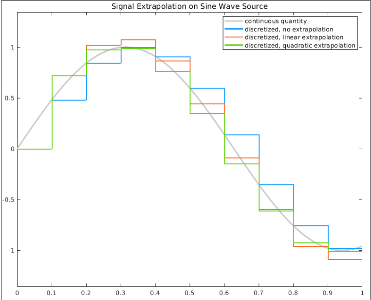 В начале моделирования при недостаточном количестве прошлых значений сигнала автоматически используется метод экстраполяции более низкого порядка. Способы экстраполяции более высокого порядка используют большее количество прошлых значений сигнала для прогнозирования текущего значения сигнала и могут улучшить точность прогнозирования. Однако методы экстраполяции высокого порядка также могут быть численно нестабильными [1]. Наилучший метод экстраполяции зависит от характера сигнала .