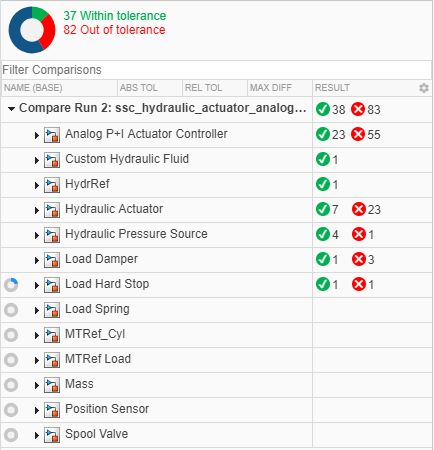 Серии и сигналы, используемые в этом примере, относительно малы и просты. При сравнении длинных сигналов или прогонов, содержащих много сигналов, инспектор данных моделирования отображает инкрементные индикаторы хода выполнения во время сравнения, а кнопка Сравнить становится кнопкой Отмена (Cancel), которую можно нажать для отмены сравнения в любой точке. Для иерархических данных столбец Результаты (Results) в представлении сравнения суммирует результаты для каждого иерархического узла.