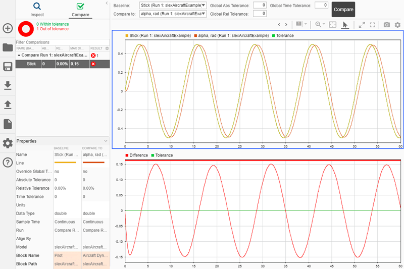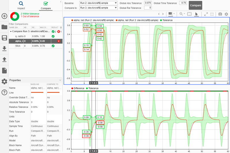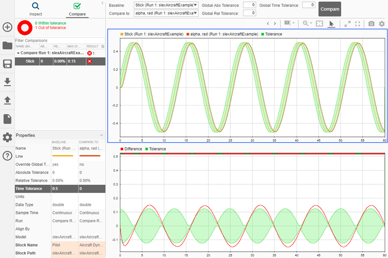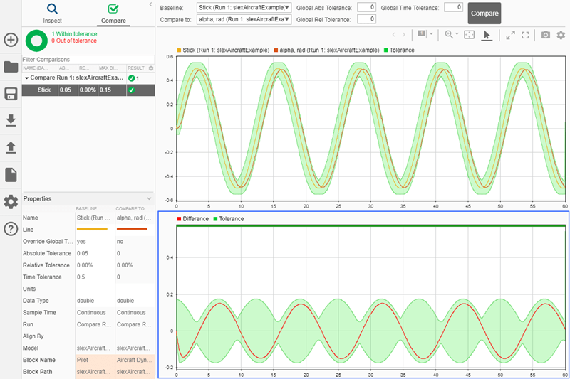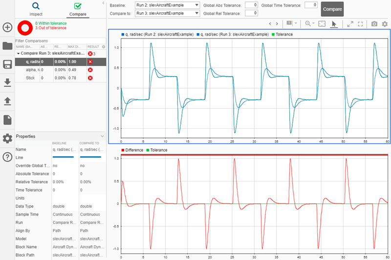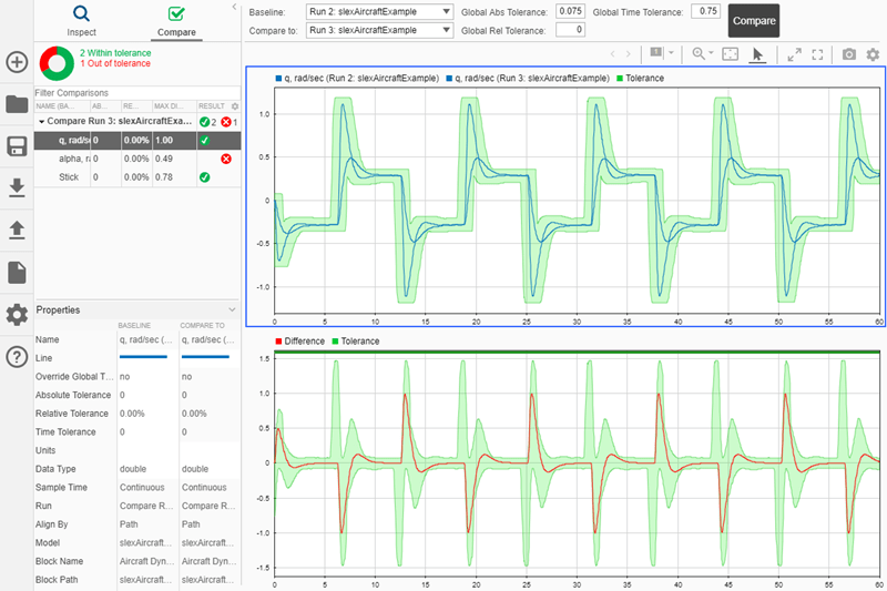 Для определения сигналов при сравнении прогона можно добавить глобальные допуски для сравнения. Изменение глобального допуска по времени на 0.75 и глобальный допуск Abs к 0.075и нажмите кнопку «Сравнить» для выполнения сравнения. Инспектор данных моделирования рисует полосу допусков вокруг сигнала базовой линии и на графике разностей со знаком в нижней половине области графического просмотра. С новыми значениями допуска, Stick и q, rad/sec сигналы проходят сравнение.