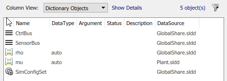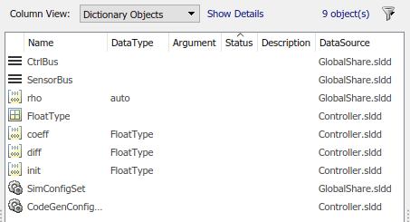 Все глобальные общие переменные, такие как CtrlBus и SensorBus, проживание в GlobalShare.sldd. Переменная init, которые оба компонента контроллера совместно используют, находятся в Controller.sldd.