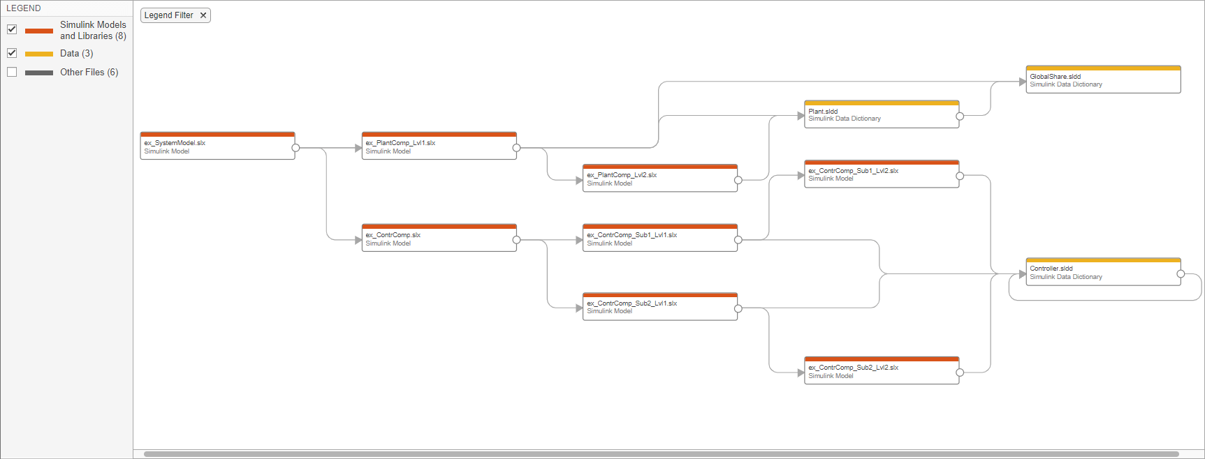 Модель системы, ex_SystemModel, связан со словарем GlobalShare.sldd. Компонент завода и компонент контроллера связаны с отдельным словарем. Для доступа к общим данным словари компонентов ссылаются на словарь GlobalShare.sldd. Эти словари образуют справочную иерархию.