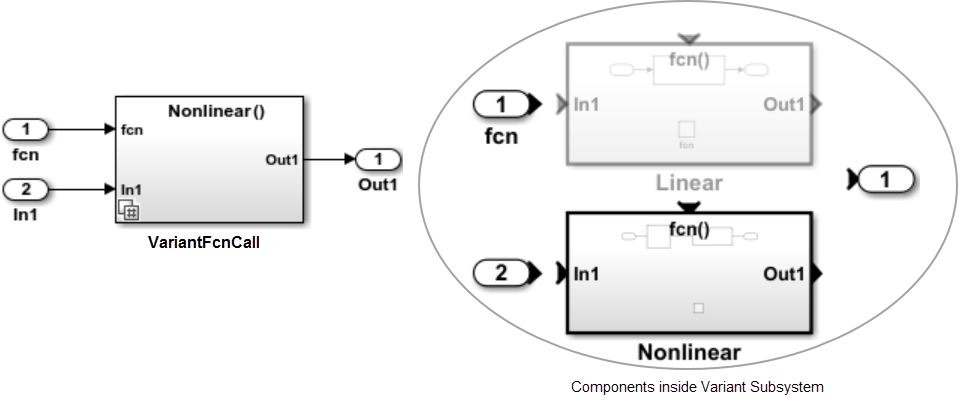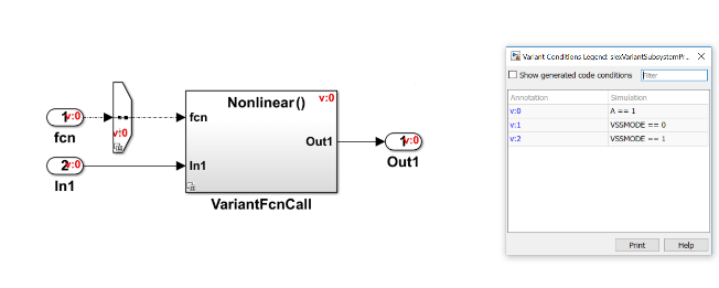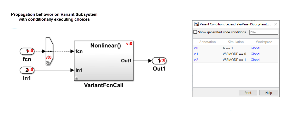 Рассмотрим эту модель. Здесь, когда условие распространяется на блок Inport (fcn), одно и то же условие распространяется на все блоки Inport и Outport (как показано в условном обозначении исполнения) и делает блок Variant Subsystem условным.