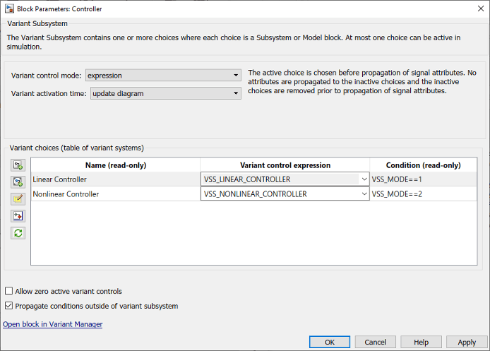 Блок контроллера является вариационной подсистемой, которая обеспечивает Linear и Nonlinear выбор. Linear выбор активен, когда V = 1, и Nonlinear выбор активен, когда V = 2. Здесь, V является переменной управления вариантом Simulink.Parameter тип. Выберите блок Controller и в меню Simulink щелкните Схема > Параметры блока (подсистема). Убедитесь, что установлен флажок Распространить условие вне подсистемы исполнения.