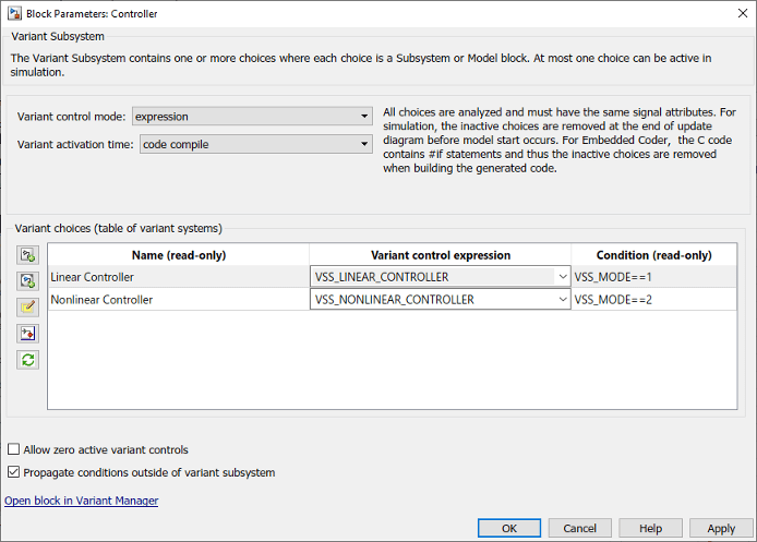 Чтобы распространить условия вне Variant Subsystem с помощью условий создания препроцессора, установите флажок Распространить условия вне Variant Subsystem и установите для параметра Variant activation time значение code compile в диалоговом окне «Параметры блока» подсистемы исполнения.