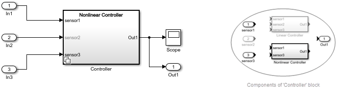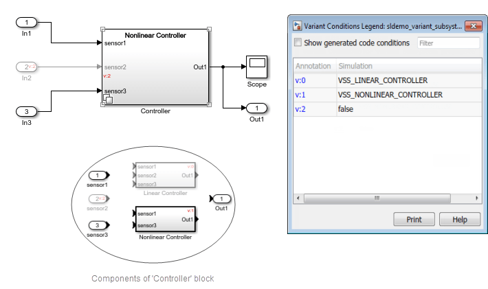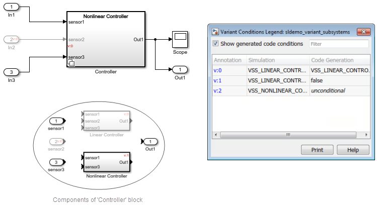 В вариационной подсистеме (Controller), sensor1 и sensor3 используются в линейном и нелинейном контроллерах, но sensor2 используется только в линейном контроллере. Следовательно, sensor2 блок выполняется только в том случае, если параметр «Линейный контроллер» активен и не выполняется для любого другого параметра. Чтобы убедиться, что компоненты находятся вне вариационной подсистемы (Controller) знают об активном или неактивном состоянии блоков с блоком Variant Subsystem, условие блока должно распространяться за пределы блока Variant Subsystem.