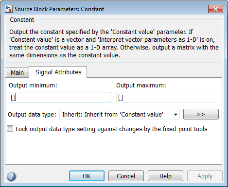 Блоки Simulink определяют тип данных своих выходов по умолчанию. Многие блоки позволяют переопределить тип данных по умолчанию и явно указать тип выходных данных, используя параметр блока, который обычно называется «Тип выходных данных». Например, параметр Тип выходных данных (Output data type) отображается на панели Атрибуты сигнала (Signal Attributes) диалогового окна Блок константы (Constant block).