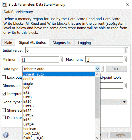 Допустимые значения типов данных различаются между блоками. Для просмотра типов данных, поддерживаемых определенным блоком, можно использовать раскрывающееся меню, связанное с параметром типа данных блока. Например, в раскрывающемся меню «Тип данных» диалогового окна «Память хранилища данных» перечислены поддерживаемые типы данных, как показано здесь.