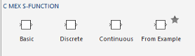 C MEX S-функциональные блоки в базовых, дискретных, непрерывных шаблонах. Можно также создать S-функцию C MEX из существующего примера.