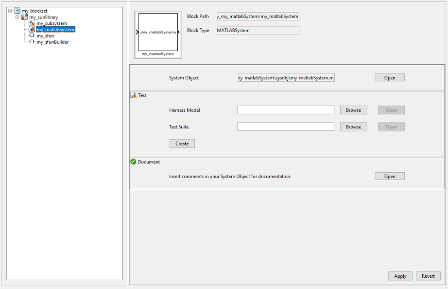 При щелчке по блоку MATLAB System в дереве блоков можно отредактировать код объекта System и добавить тест с помощью рабочей области. Чтобы добавить документацию для системного блока MATLAB, добавьте комментарии в объектный код системы, и они будут автоматически добавлены в документацию по блокам.