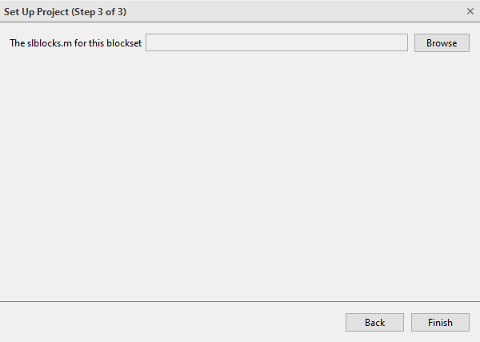 В диалоговом окне «Настройка проекта» (шаг 3 из 3) укажите slblocks.m файл сведений о библиотеке для этого блоксета. Этот файл содержит сведения о настройках блоксета и расположении верхней библиотеки. Без этого файла невозможно правильно настроить проект. Нажмите кнопку Обзор (Browse), чтобы выбрать файл.