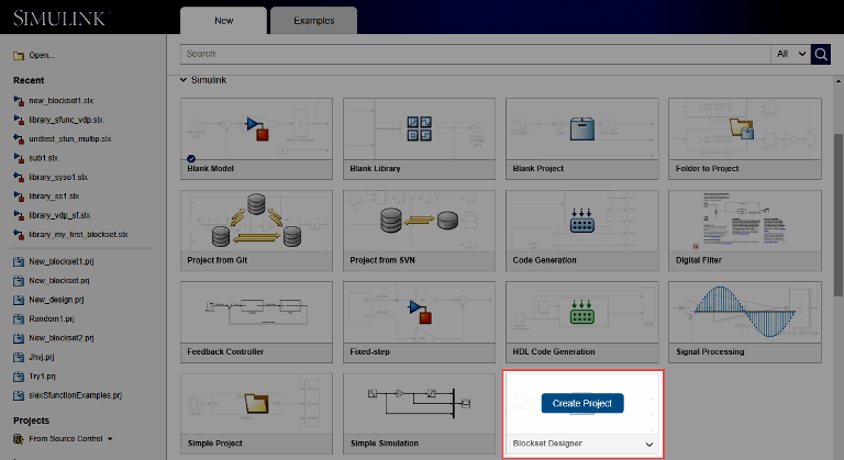 Откройте начальную страницу Simulink. В разделе «Simulink» выберите «Blockset Designer» и нажмите «Create Project».