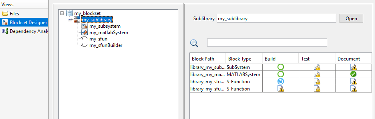 Если в проекте блоксети имеется блок S-функции или S-функция Builder, можно контролировать свойства блока, создавать и редактировать код S-функции, создавать сценарий, добавлять тест и документ в блок.