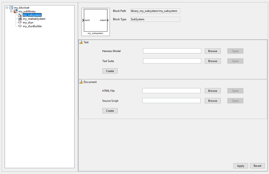 Помимо упомянутых выше блоков можно добавлять и настраивать другие доступные блоки библиотеки Simulink в проекте, но нельзя выполнять какие-либо операции, такие как добавление теста или документации.