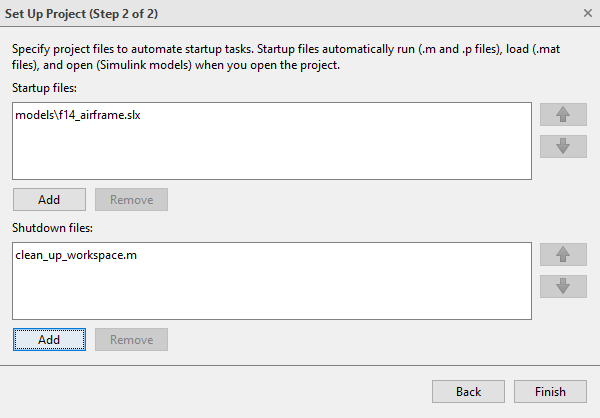 Используйте файлы запуска для настройки параметров при открытии проекта. Автоматически запускаемые файлы (.m и .p файлы), загрузить (файлы .mat) или открыть (модели Simulink) при открытии проекта.