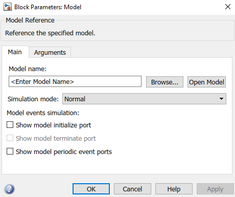 Введите имя ссылочной модели в поле Имя модели (Model name). Это имя должно содержать менее 60 символов, исключая .slx или .mdl суффикс.