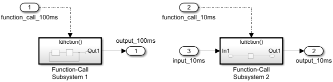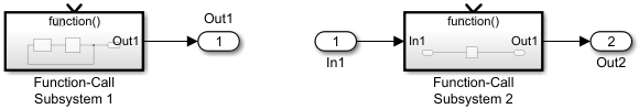 На верхнем уровне модели export-function функции моделируются в рамках блоков Function-Call Subsystem, function-call Model, Simulink Function и S-Function. В этом примере используются блоки Function-Call Subsystem для моделирования двух функций.
