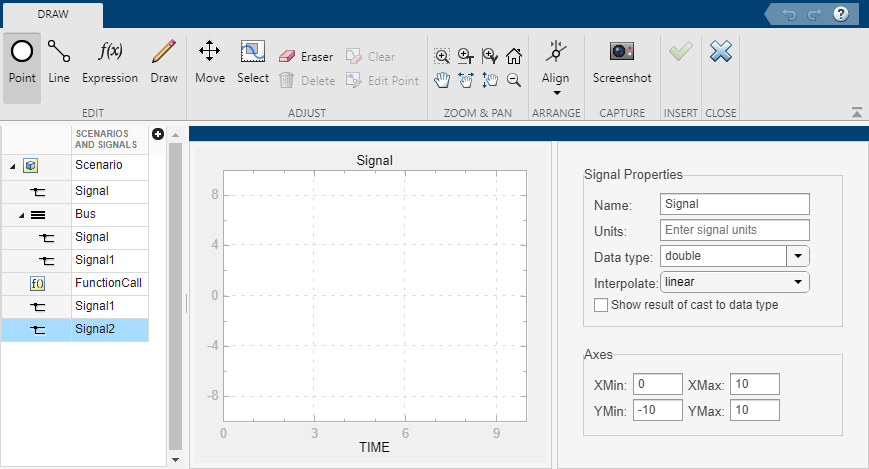 Чтобы добавить произвольные данные сигнала, на вкладке «Редактор сигналов» выберите «Сигнал» > «Рисовать сигнал». Откроется вкладка Рисование (Draw).