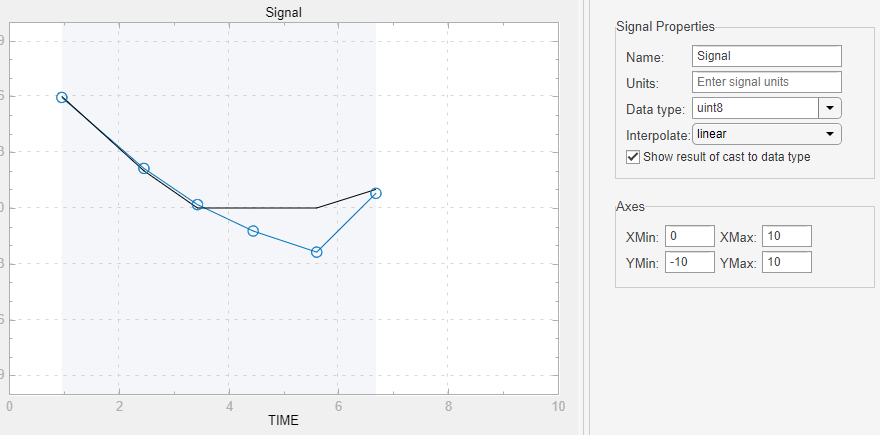 Для работы со свойствами сигнала используйте параметры в разделе «Свойства сигнала». Например, чтобы увидеть измененные значения сигнала при изменении типов данных в параметре Тип данных, выберите Показать результат приведения к типу данных. Исходная линия синяя, измененные значения представлены черной линией. На этом рисунке показана сигнальная линия с отрицательными двойными значениями, преобразованными в uint8.