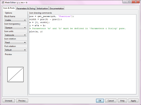 pos = get_param(gcb, 'Position'); width = pos(3) - pos(1); x = [0, width]; y = m*x + b; % Parameters 'm' and 'b' must be defined in 'Parameters & Dialog' pane. plot(x,y)