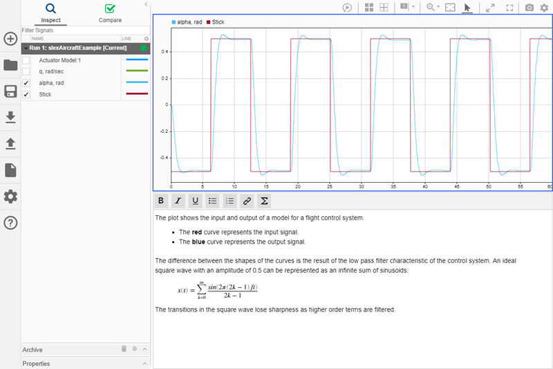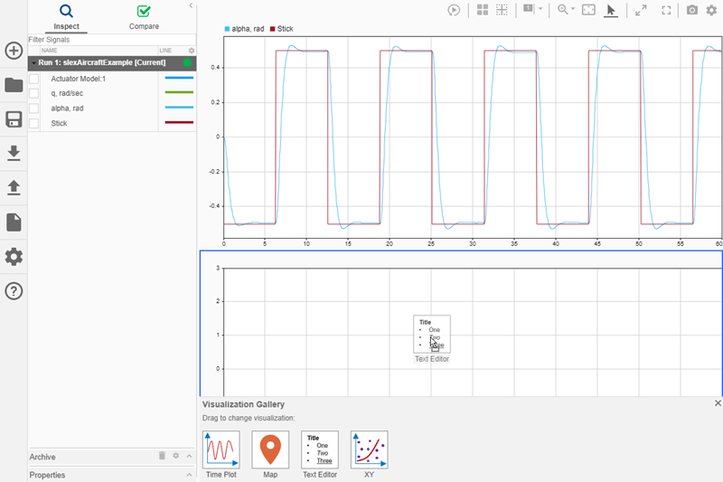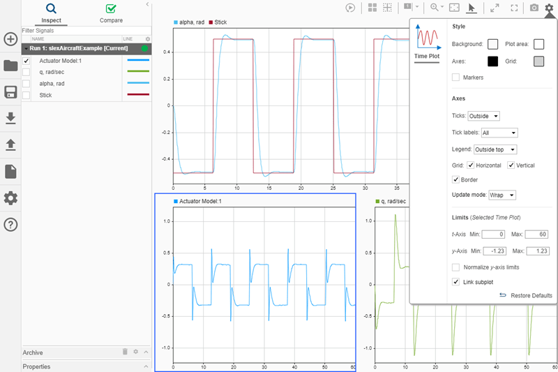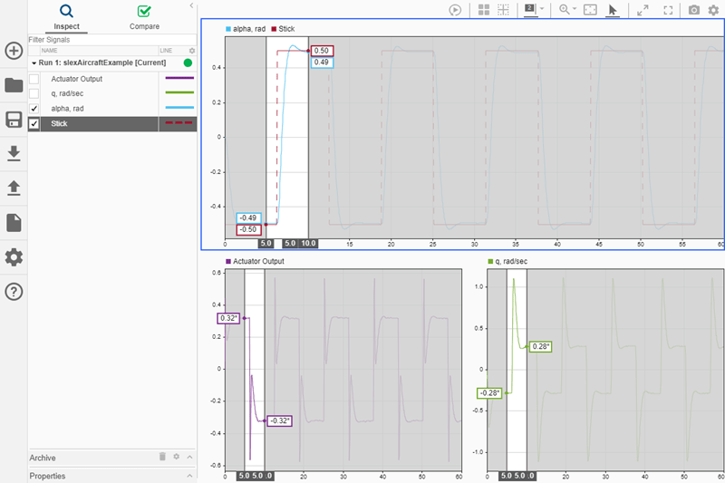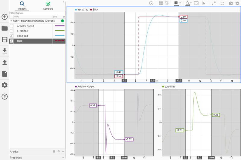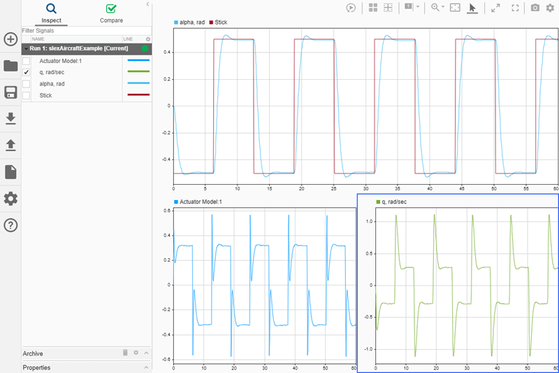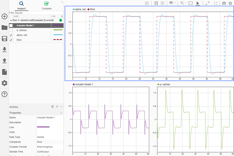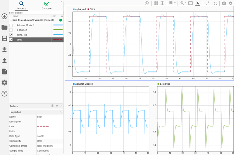 Графики могут помочь продемонстрировать важные особенности или тенденции в ваших данных и позволить вам поделиться своими выводами с другими. Инспектор расчетных данных (Simulation Data Inspector) позволяет выбирать различные типы визуализации и компоновки, а также настраивать образы графиков и сигналов для наиболее эффективного представления данных. В этом разделе используются данные моделирования, созданные в результате моделирования slexAircraftExample модель, которая регистрирует выходные данные блока модели привода и Stick, alpha, rad, и q, rad/sec сигналы.