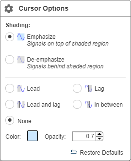 В этом примере выберите опции «Отменить подчеркивание» и «Опережение и отставание». Щелкните в области печати, чтобы закрыть диалоговое окно «Параметры курсора». Оттенок серого скрывает область вне курсоров и подсвечивает сигнальную область между курсорами. Переместите курсоры, чтобы выделить интересующую область, например, первый передний край формы сигнала.