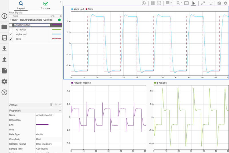 Чтобы изменить имя сигнала, дважды щелкните имя сигнала в рабочей области или архиве или измените поле Имя на панели Свойства. Изменение имени Actuator Model: 1 сигнал на Actuator Output.