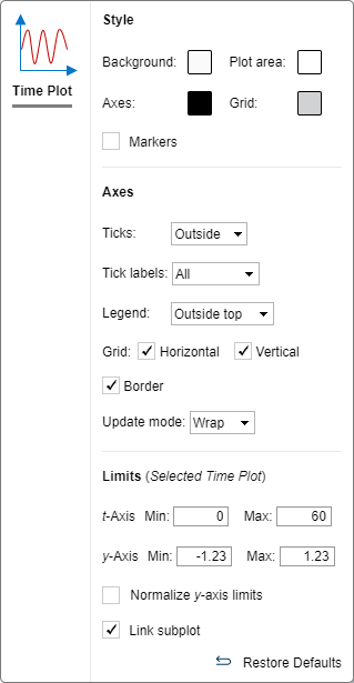 В разделе «Пределы» можно управлять пределами осей t- и y для отдельных вложенных графиков. Можно также нормализовать ось Y. За исключением пределов по оси t, параметры, заданные в разделе «Пределы», применяются к активному вложенному графику. Для индивидуальной настройки пределов по оси t для вложенного графика отсоедините вложенный график. Дополнительные сведения см. в разделе Связанные вложенные печати.