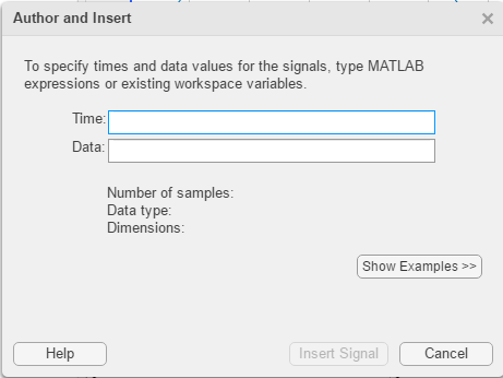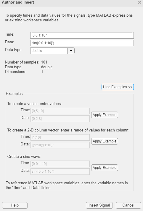 Для просмотра примеров записей Time и Data нажмите кнопку Show Examples. Чтобы поэкспериментировать с сигналами из этих примеров, нажмите кнопку Применить пример (Apply Example) для соответствующего примера. Можно также изменить примеры перед вставкой.