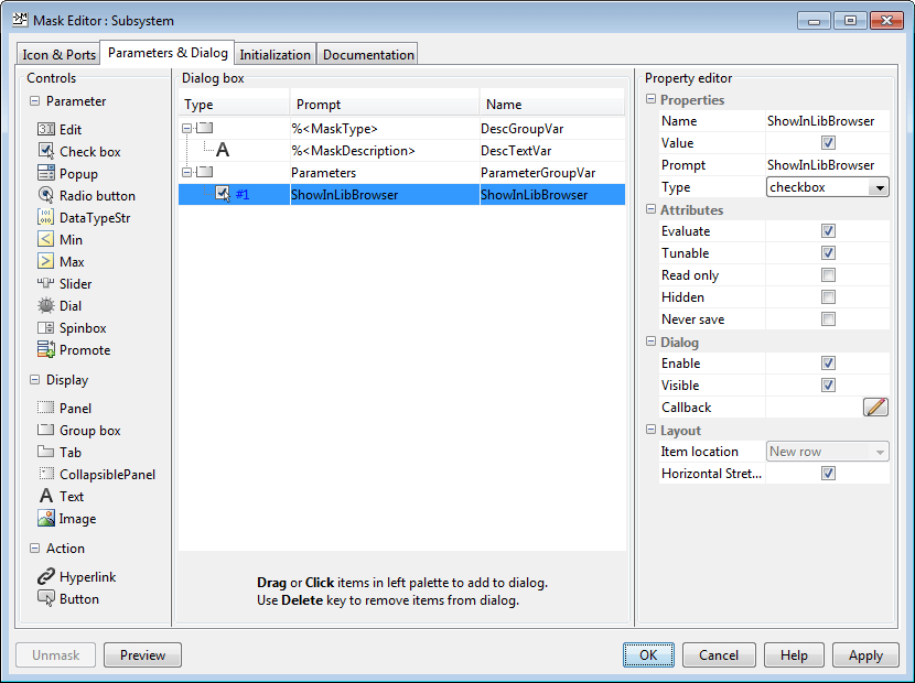 Если блок подсистемы в библиотеке пуст и его OpenFcn обратный вызов содержит код, который выполняет действие, отличное от указания на библиотеку, после чего необходимо добавить 'ShowInLibBrowser' маскировать параметр подсистемы, чтобы он отображался в браузере библиотеки.