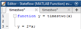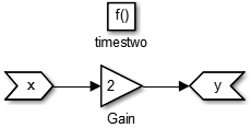 В следующих разделах показано, как создать функцию Simulink для функции y = timestwo(x). Функция умножает значение (x) от вызывающего абонента по 2, а затем отправляет вычисленное значение (y) обратно к вызывающему абоненту. Для вызова функции см. раздел Callers функции Simulink: Function Caller block, MATLAB Function block, Stateflow chart.