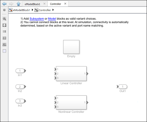 При создании прототипов вариантов можно создать пустые блоки подсистемы без входов или выходов в блоке подсистемы вариантов. Пустая подсистема воссоздает ситуацию, в которой подсистема неактивна без необходимости полного моделирования варианта. Для выбора пустого варианта укажите условие активации варианта или прокомментируйте условие варианта путем размещения % символ перед условием.