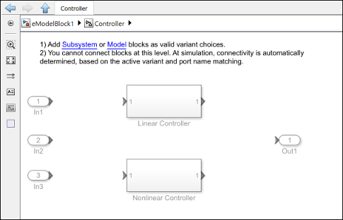 Можно добавлять только блоки Inport, Outport, Subsystem и Model внутри блока Variant Subsystem. Можно передавать управляющие сигналы через порты данных.