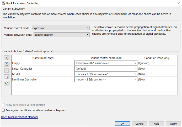Щелкните правой кнопкой мыши значок в блоке «Variant Subsystem» и выберите «Block Parameters (Subsystem)».