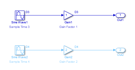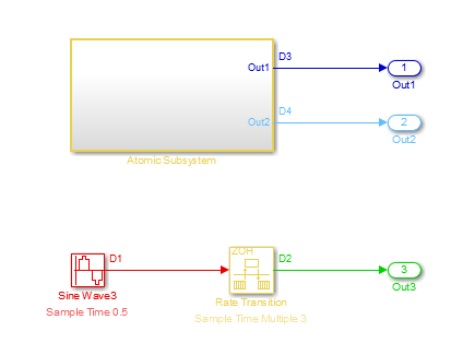 Блок Rate Transition в этой модели служит в качестве удержания нулевого порядка. С момента Sample Time Multiple параметр установлен на 3, вход блока перехода скорости имеет частоту дискретизации 0,5, тогда как выход имеет скорость 1,5.