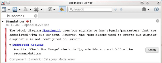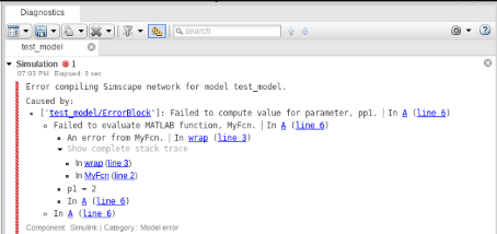 Средство просмотра диагностики может отслеживать местоположение ошибки, чтобы можно было легко исследовать ошибки в модели. Если ошибка находится в файле, вызываемом из другого файла, диагностика отображается как расширяемый стек. При необходимости можно развернуть или свернуть стек. При развертывании стека отображается информация о файле и строке, в которой находится ошибка или предупреждение. Для перехода к ошибке или предупреждению можно щелкнуть любую из ссылок. Можно также увидеть то же диагностическое сообщение с включенной трассировкой стека при использовании sim в MATLAB ®.