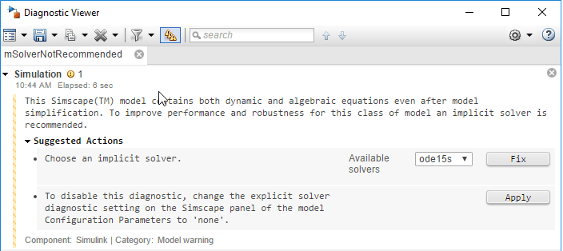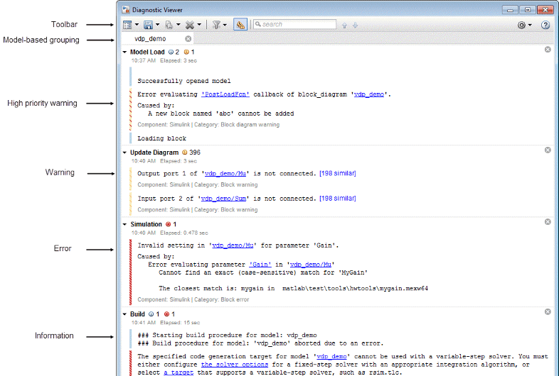 Просмотреть и диагностировать ошибки и предупреждения, генерируемые моделью, можно с помощью средства просмотра диагностики. Программа Diagnostic Viewer отображает три типа диагностических сообщений: ошибки, предупреждения и информацию. Модель генерирует эти сообщения во время выполнения, такие как загрузка модели, моделирование или диаграмма обновления.