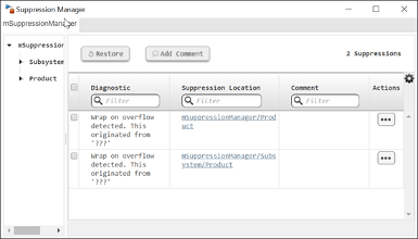Диспетчер подавления отображает имя модели, расположение подавления и комментарии диагностики в табличном формате. С помощью меню «Действия» можно добавлять и редактировать комментарии, подавлять диагностику или перемещать диагностику на уровень подсистемы с уровня блока (Добавить в родительский).