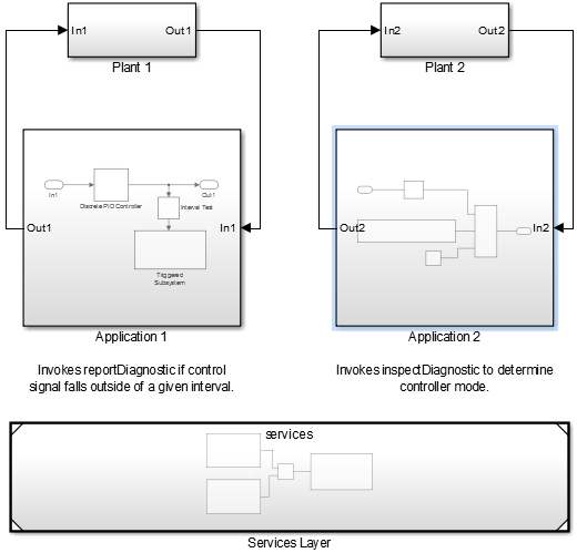 Для моделирования архитектур клиент-сервер можно использовать блоки Simulink Function и блоки Function Caller. Эта архитектура использует, в частности, память и средства диагностики.