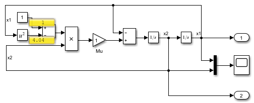 Для многих блоков, сигналы которых содержат данные, Simulink ® может отображать значения сигналов (блочный выход) в виде меток значений портов (аналогично подсказкам по инструментам) на блок-схеме во время и после моделирования. Метки значений портов отображают выходные значения блоков, когда Simulink выполняет методы вывода блоков. Эта модель показывает метку значения порта для портов в блоках Константа (Constant) и Математический (Math), выходные значения 1 и 4.04.