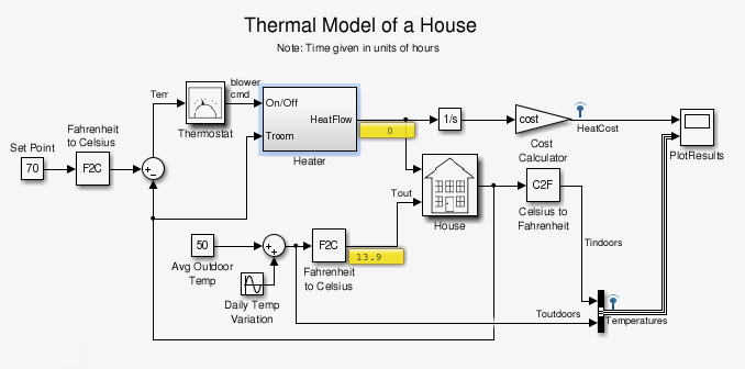 Отображение подсказок по значению порта может помочь при интерактивной отладке модели. Например, на рисунке показан выходной сигнал тепловой модели для дома.