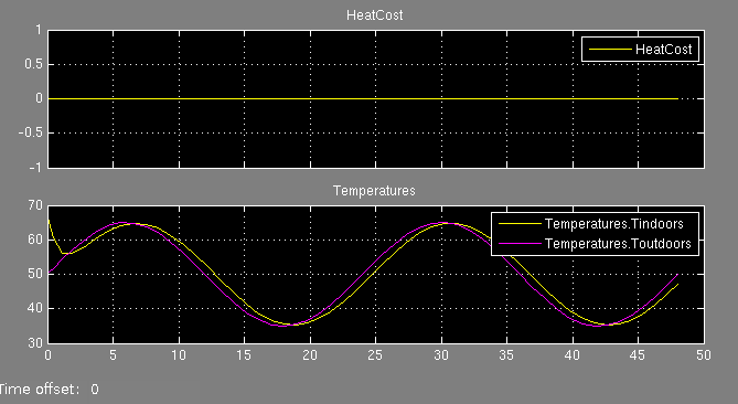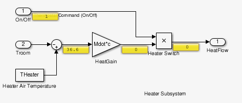 В таких случаях отладка блоков в модели в интерактивном режиме может помочь изолировать ошибку. Метки значений портов предоставляют информацию на выходе каждого блока в модели. Таким образом, в этом примере, если сделать шаг вперед с помощью Simulation Stepper, можно увидеть, что выход подсистемы нагревателя 0 на каждом шаге времени.