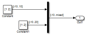 Диапазоны отображаются в формате [min..max]. В приведенном выше примере расчетный диапазон на выходном порту блока мультиплексора отображается как [-10..mixed], поскольку два сигнала, объединяющие блок мультиплексора, имеют одинаковый минимум конструкции, но разные максимумы конструкции.
