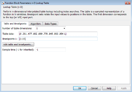 Предположим, вы хотите аппроксимировать общий логарифм (основание 10) во входном диапазоне [1, 10] без выполнения дорогостоящих вычислений. Эту аппроксимацию можно выполнить с помощью блока таблицы подстановки, как описано в следующей процедуре. (Если требуется пропустить процедуру, можно открыть модель напрямую.)
